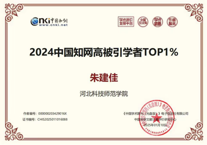 近日,中国知网下属的中国科学文献计量评价研究中心基于中国知网收录的国内学术成果,首次开展学者学术影响力客观评价,并发布了“2024中国知网高被引学者”名单。太阳成集团tyc234cc主页朱建佳老师入选中国知网高被引学者Top1%,武春成、李晓颍两位老师入选中国知网高被引学者Top5%。